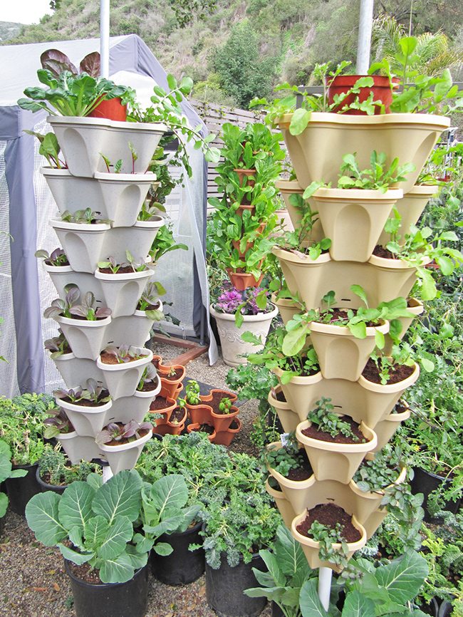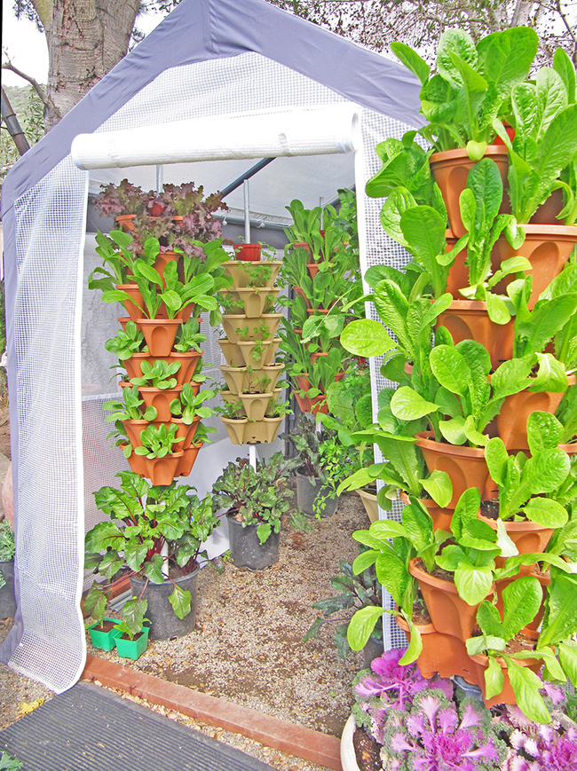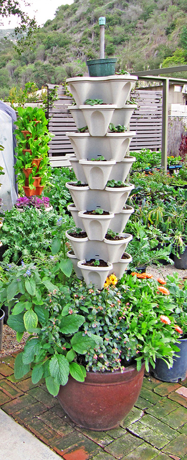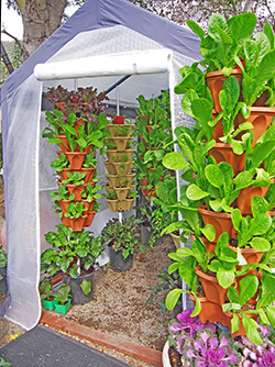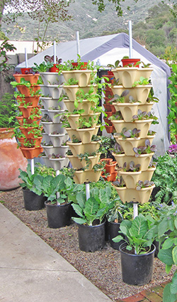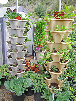 EnviroIngenuity® Vertical Gardens from Alegría are offered with everything you need to start growing healthy greens, vegetables, herbs, and fruits at home. Our custom, single-tower hydroponic Vertical Garden systems can be placed anywhere there is sufficient light, including balconies and patios or installed as vertical gardens in your existing raised-bed garden. The Vertical Garden can be moved easily and the stacking pots can be removed and taken inside should weather conditions become severe (too cold or too windy). Up to 50 plants can be grown in less than two square feet. And replanting is simple, just remove the pots, recycle the coir, replant with new seedlings and re-stack. Each Vertical Garden tower comes with patented stacking pots, a custom base pot, all hardware to assemble the tower, plus specially formulated plant nutrients. Certified organic, non-GMO seeds and mature seedlings ready-to-plant are available on special order. Our stacking pots are available in three colors to match your décor. Choose either Terra Cotta, Sandstone or Tuscany or mix and match to suit your taste. The standard Home Garden tower comes with six (6) stacking pots and a large custom base pot from our inventory. We recommend a maximum of eight (8) stacking pots per tower. Home installation, consulting (design/build residential and commercial hydroponic vertical farms), automatic watering systems and custom planting services are also available. |
