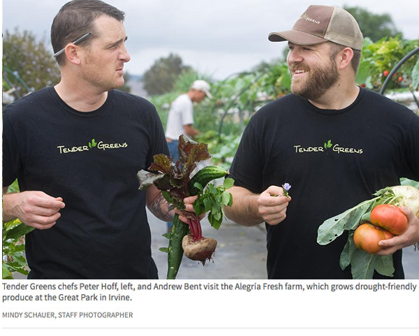 At the two Tender Greens restaurants in Irvine, a partnership with Alegría launched within a couple of weeks of Bent’s visit. Cutter, whose 3-year old Great Park farm is 2 miles from the Spectrum, often handles each delivery.