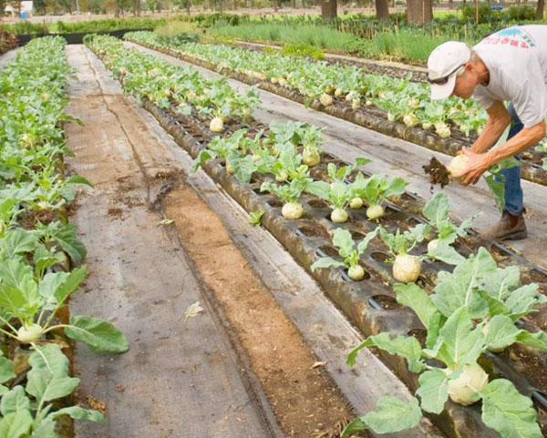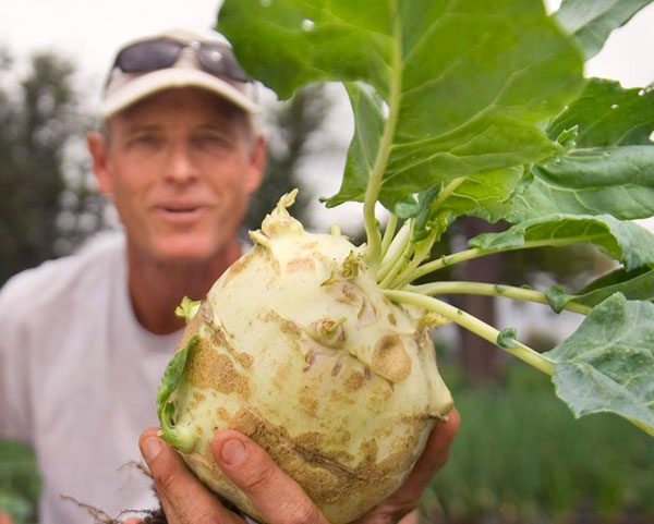 Erik Cutter shows off a freshly harvested Kohlrabi.